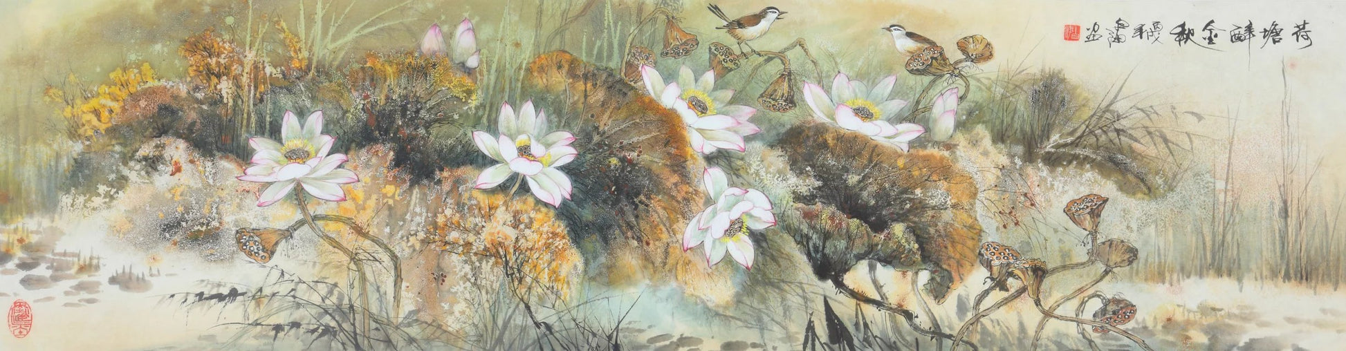 Painting Description: The Chinese word for lotus is a homonym of the word for harmony, and people often use it to decorate their homes during the Spring Festival. The lotus flower blossom above the surface of stagnant water in the murky depths of ponds and lakes. One can almost imagine it is a beautiful young woman or fairy rising out of the water. The ancient Chinese revered the lotus as a symbol of purity and elegance, so they compared lotus to noble gentlemen.It also symbolizes beautiful love. The lotus root of the lotus represents the inseparable love in couples. A lotus flower is considered the symbol of purity in China, because it grows in muddy water but remains unsullied; it is delicate and beautiful without being fussy. The lotus blossom represents the nobility of flowers because of its cultural significance.